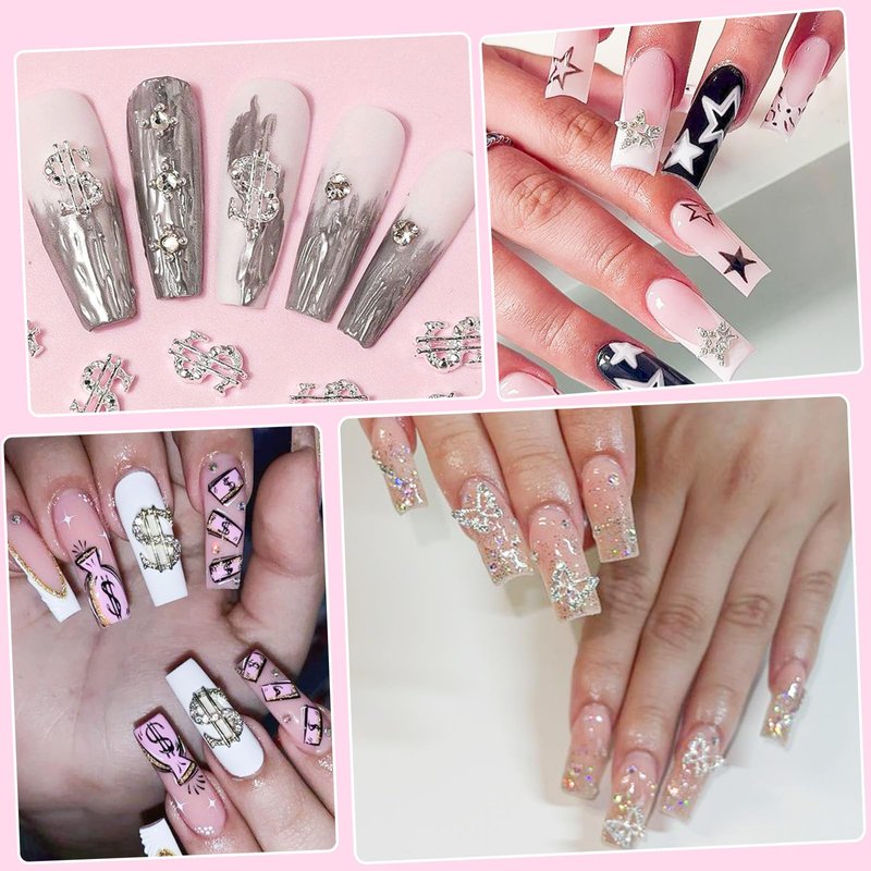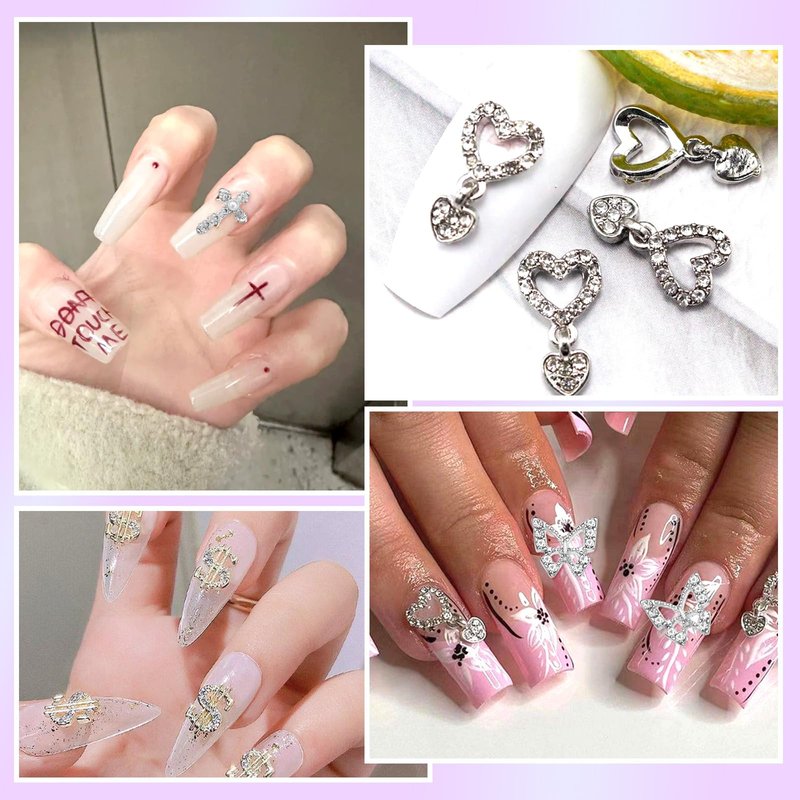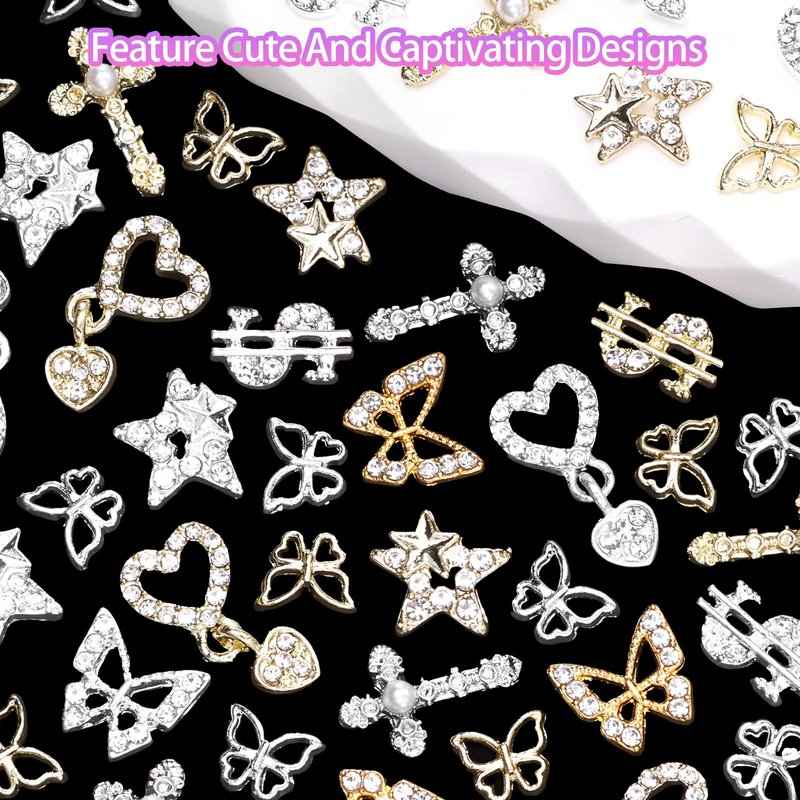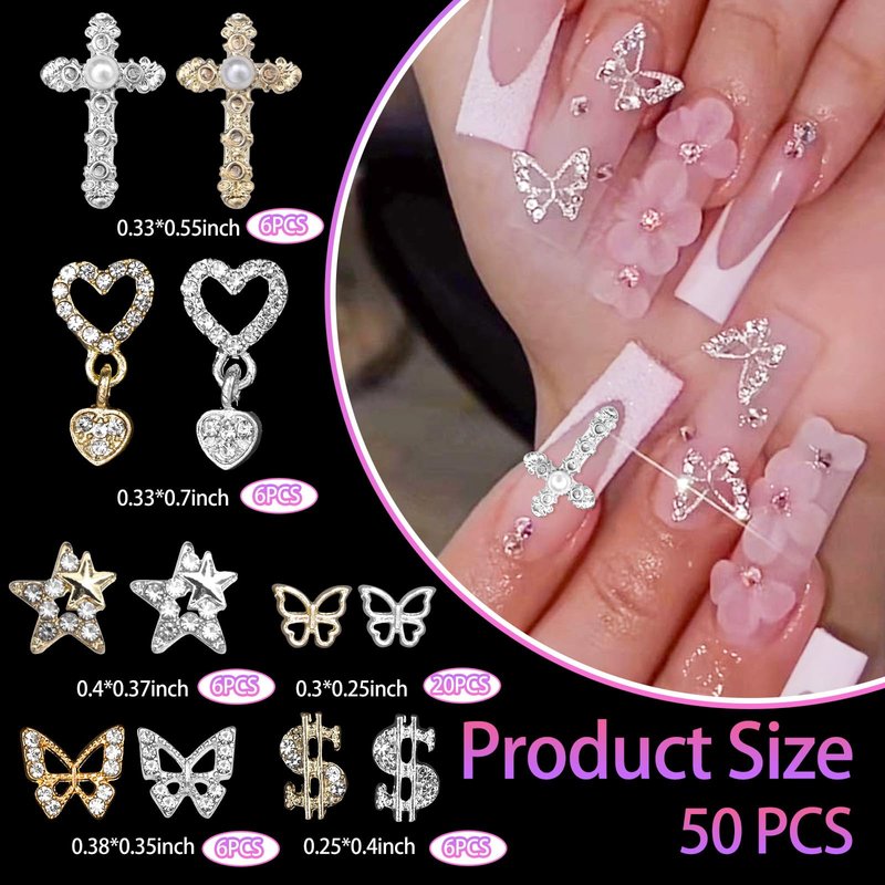 - ★Nail Gems Charms: Including gold silver alloy butterfly/ dollars/ cross/ star/ heart charms for nails, you can diy your nail art randomly. Adding more 3D effect to your nail art design.