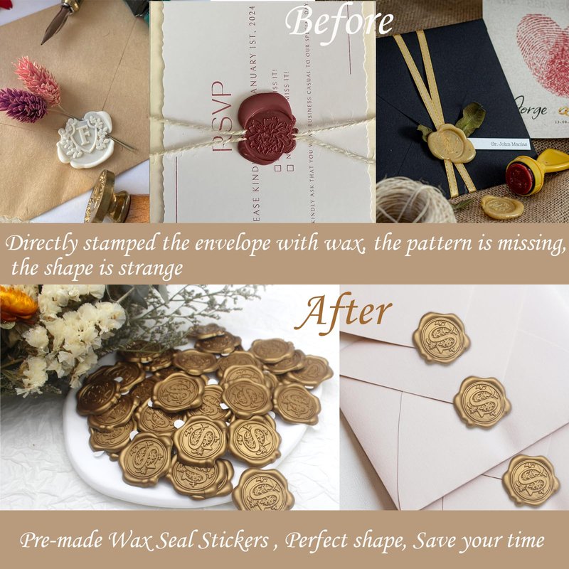 - Premium Quality: Made from high-quality real sealing wax, our wedding wax seal stickers are durable and adhesive, ensuring a secure seal on various surfaces such as paper, cards, envelopes, and even fabrics. The strong adhesive properties guarantee that your seals will stay intact during handling and transportation