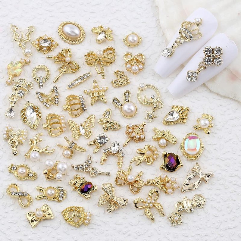 50pcs Random Gold Nail Charms Luxury Nail Rhinestones Nail Gems 3D Alloy Flower Butterfly Nail Art Charms Metal Snake Bear Heart Bow Star Charms for Nails Mix Styles Nail Jewels for Nail Art Supplies