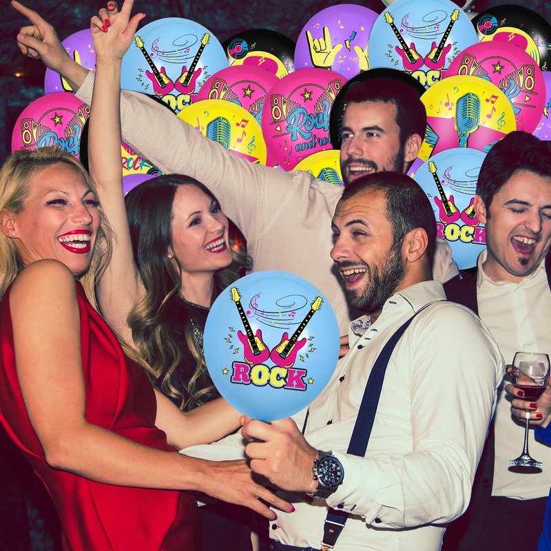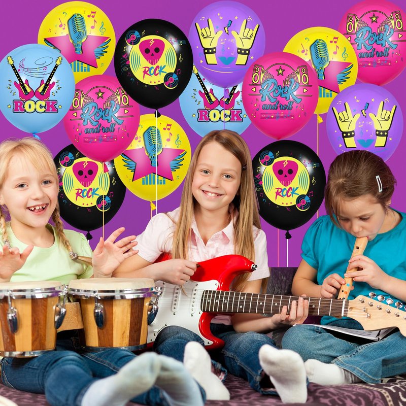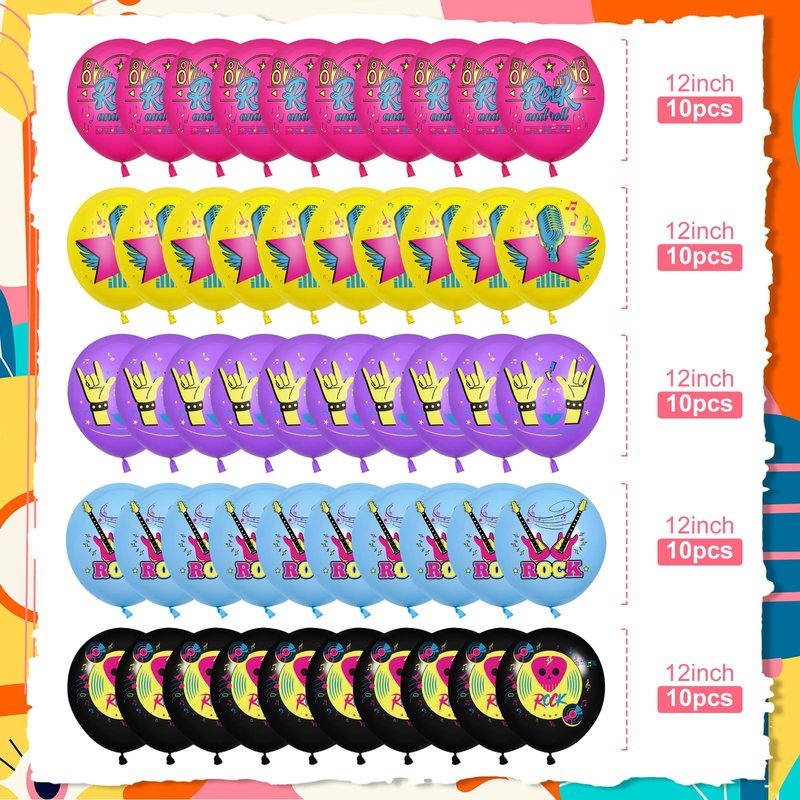 - 🎧【Rock N Roll Balloons】: This rock music balloons set includes 50pcs 12 inch balloons, 10pcs red balloons printed with “Rock and roll”, 10pcs yellow balloons printed with rock microphone pattern, 10pcs purple balloons printed with rock classic gestures pattern, 10pcs blue balloons printed with electric guitar and 10pcs black balloons printed with rock records pattern