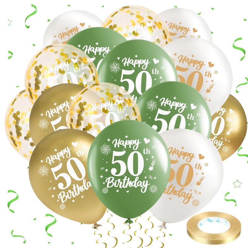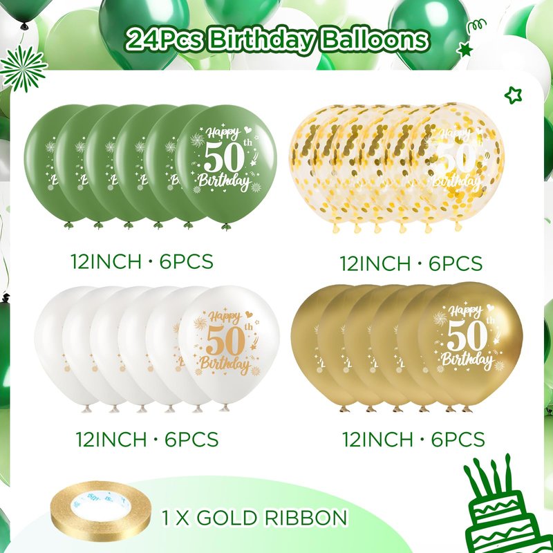 - 【50th Happy Birthday Party Decorations】: You will get 6 x 12inch Avocado green, 6 x 12inch metal gold, 6 x 12inch featured gold confetti and 6 x 12inch White latex balloons as 50th birthday party decorations, everyone will praise after seeing them, sage green balloons are essential decorations for birthday party which can be used as a photo background for everyone to record the loving moment