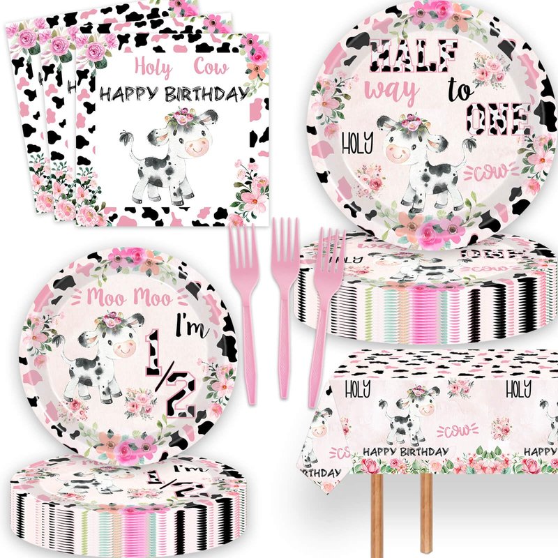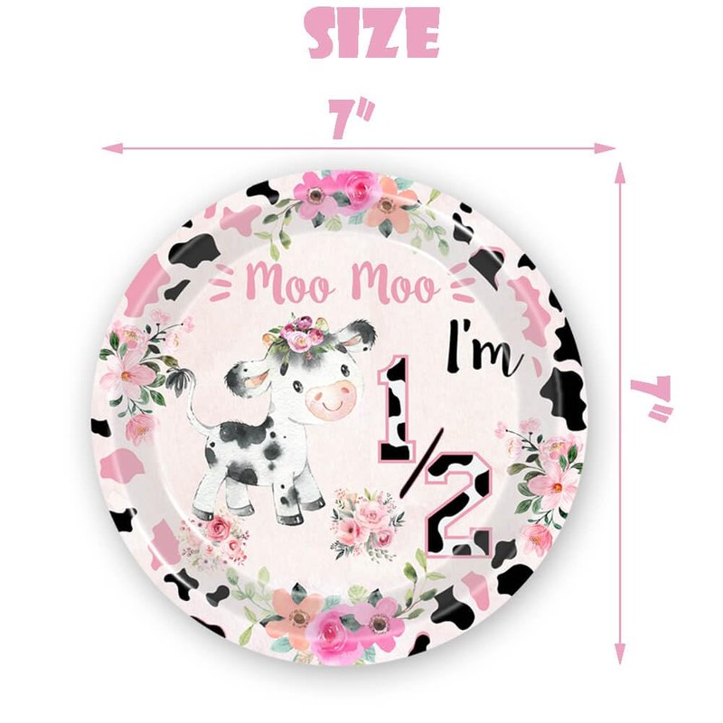 Holy cow girls half birthday party tableware is great to decorate farm animals half birthday party, holy cow baby shower party, Girls six months birthday party, Moo Moo half way to first party, etc.