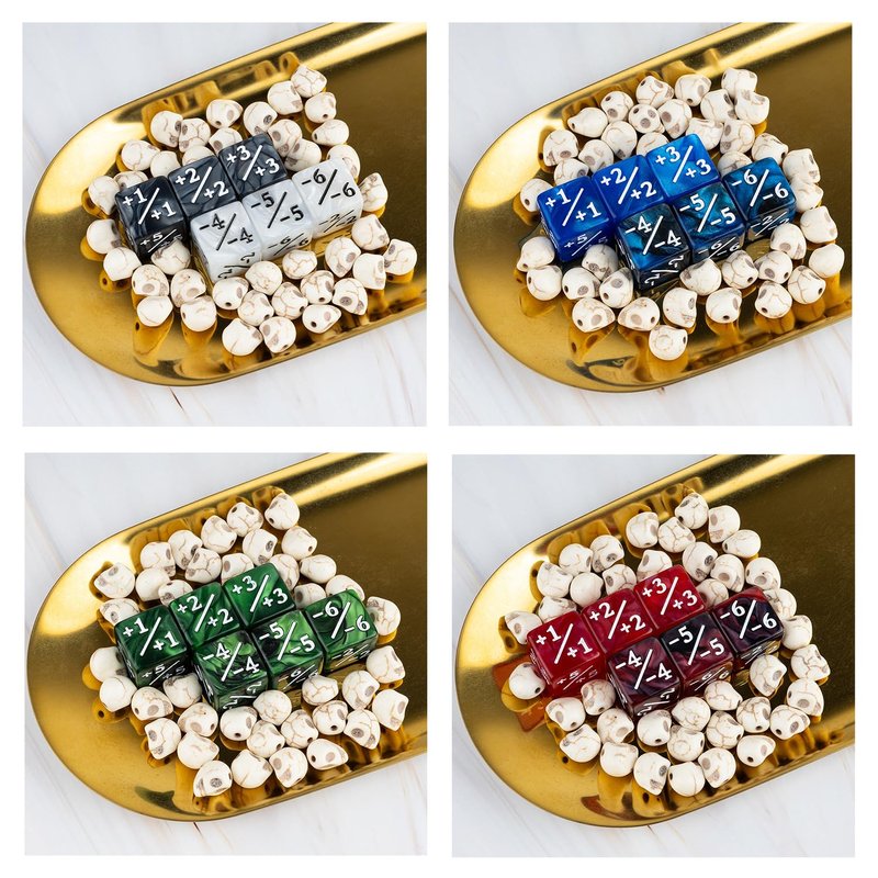 - Package Include: Total 51 pcs mtg dice counters with velvet pouch. Includes 24 pcs +1~+6 counters, 24 pcs -1~-6 dice counters. There are 8 colors, as shown in the figure. They are 0.63 inch/ 16 mm regular D6 dice. There are also 3 pcs 20mm d20 dice.