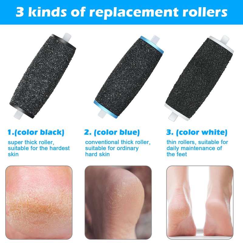 - 【Use with different roughnesses】-- Choose a suitable roller according to your foot skin condition. You can use a high-roughness roller to quickly remove hard and rough skin, and then use a small-roughness roller for detailed sanding.