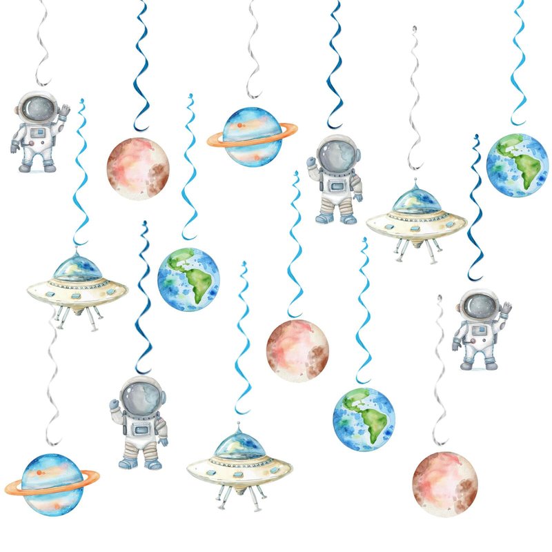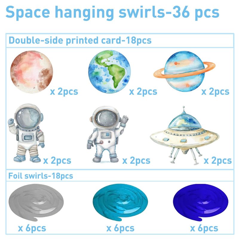 - Total 36pcs ceiling hanging swirls, including 9pcs Planet cardstock and 6pcs Astronaut cardstock and 3pcs Rocket cardstock, 18pcs aluminum foil swirls