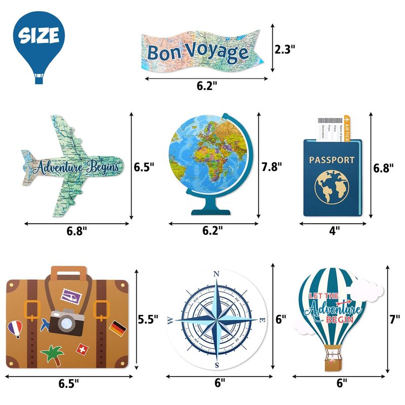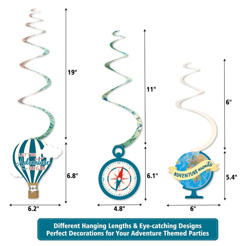 Let the Adventure Begin Banner: Each pennant measures approx. 5.3" wide and 6" tall. The length of the banner is approx. 49" to 63". Adventure Themed Table Toppers: Each table topper piece is about 7" tall x 5" wide, wooden sticks are 12" long. World Awaits Hanging Swirls: Each hanging swirl is around 4.8" to 7.1" wide, and 8.1" to 12" tall, with length about 6" to 19.5".