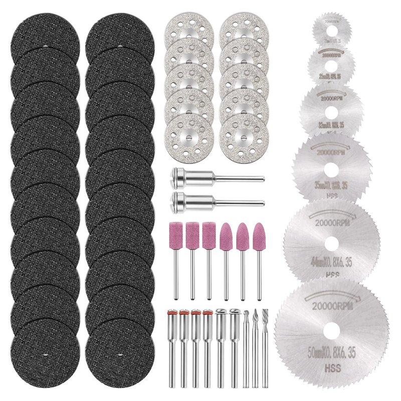 - ใPackage Detailsใ: 53Pcs Rotary tool mini cutting discs sets include 6 ร HSS wood cutting saw blade discs, 10 ร Diamond cutting discs wheels, 20 ร Resin Cutting Wheel Cut-off Discs, 6 x Abrasive Stone, 3 x Rotary Burr & 7 ร Mandrels.