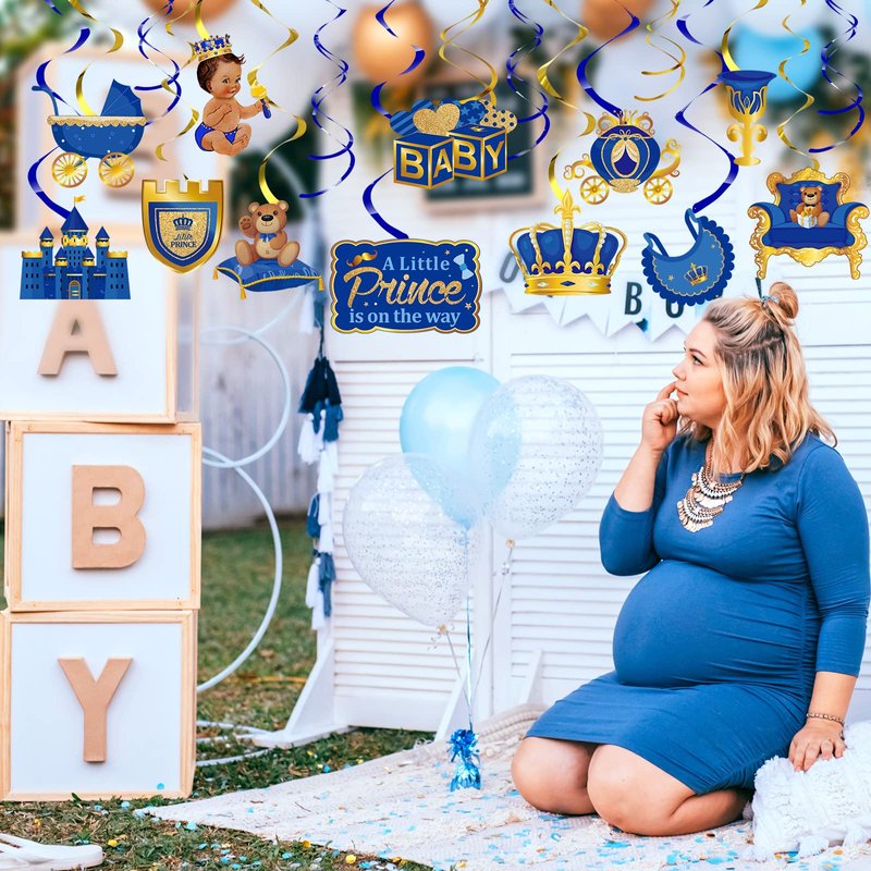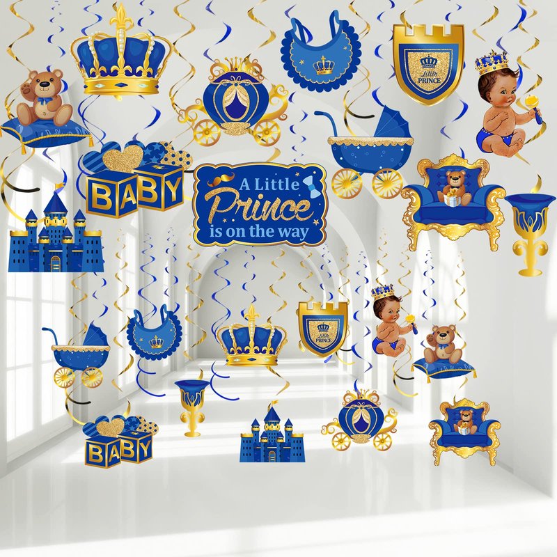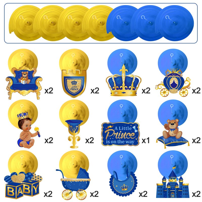 - Package Includes: you will get 53 prince baby shower hanging swirls in royal blue and gold, including 23 swirls with 23 prince themed cards, 7 double spiral decorations; These royal blue and gold prince colorway hanging decorations will make your theme party event success and make your baby shower or birthday party an impressive celebration