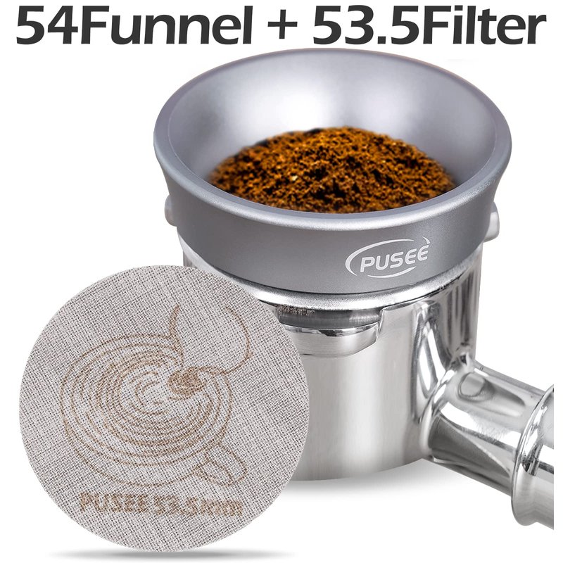 54mm Espresso Dosing Funnel & 53.5mm Puck Screen,PUSEE Coffee Dosing Ring Aluminum Metal,Reusable 1.7mm Thickness 150μm Espresso Puck Screen 316 Stainless Steel Fits 54mm Portafilter