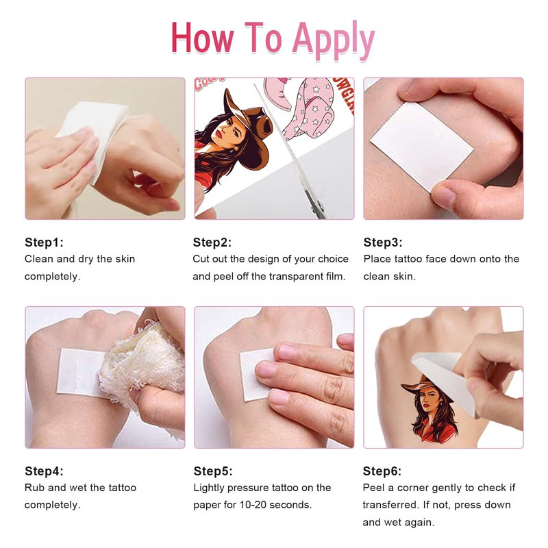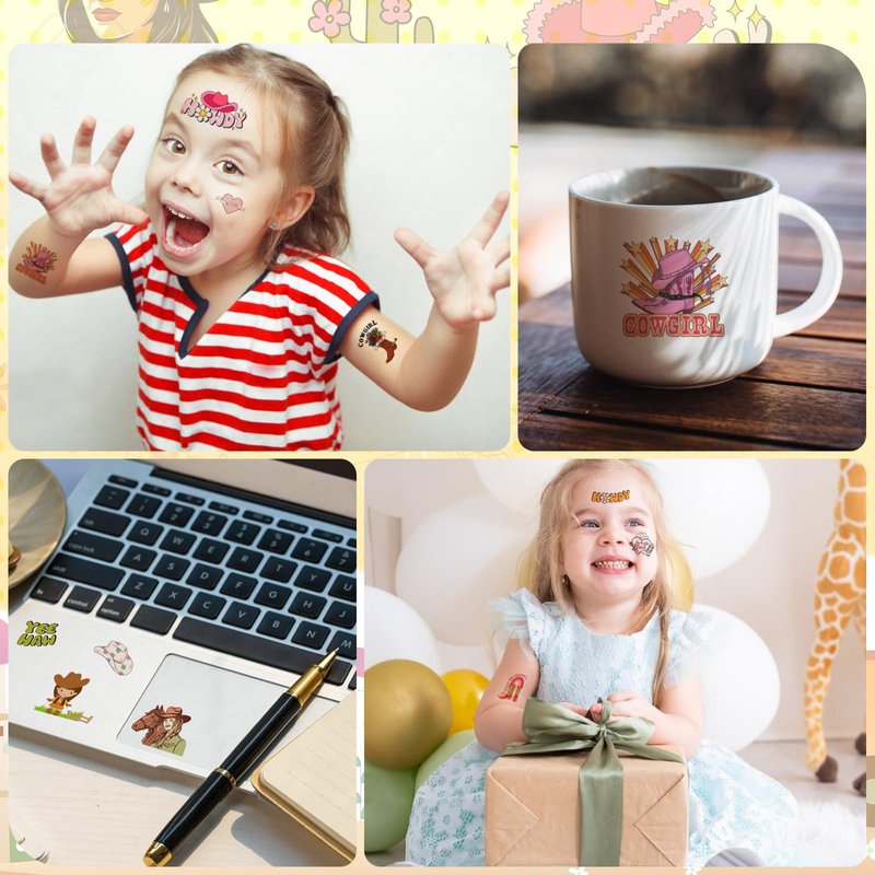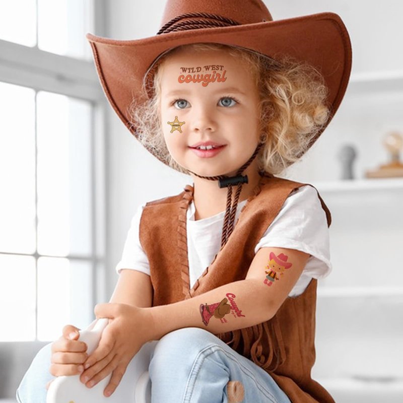 - Cowgirls Tattoos for Kids: 55pcs west cowgirl tattoos temporary for girls have hand-drawn designs of cowgirl hats, boots, horseshoes, horse, cactus, and more.
