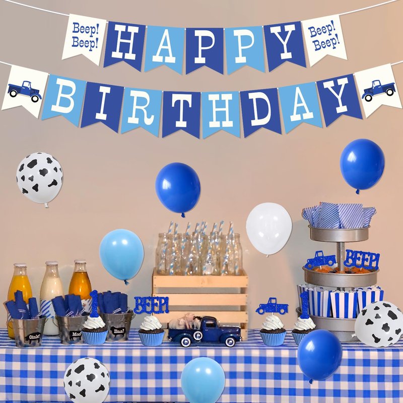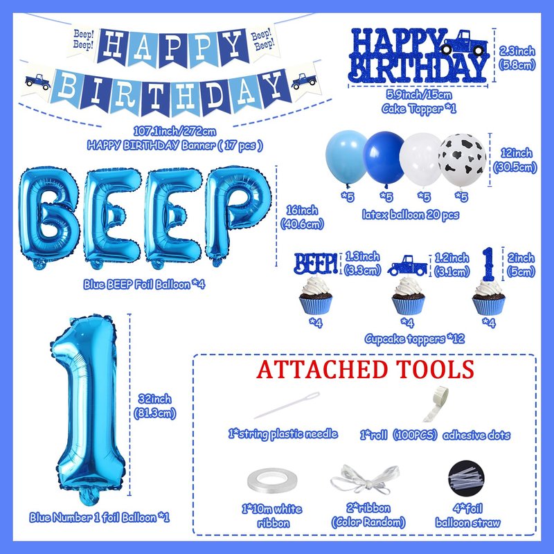 - Little Blue Truck 1st Birthday Party Decorations: This package includes 55 pieces of farm-themed party decorations, including 1*blue truck beep beep happy birthday banner(107.1inch), 20*latex balloons(12inch), 4*blue color foil balloon(16inch), 1*number 1 foil balloon(32inch), 12*small cake toppers(4*beep,4*blue truck,4*number"1") and 1*big cake topper.