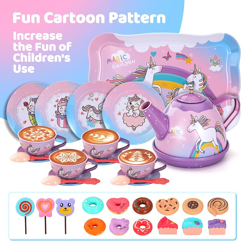 - Creating Fun Times: The realistic pretend kids kitchen pretend toy, simulation design simulation real objects, let children enjoy the fun of role-playing. Specially prepared their favorite delicious snacks to meet the little hunger and thirst in play. Bright colors, lifelike images, vivid cartoon shapes, and the Unicorn theme tin tea set for little girls have won the hearts of children.