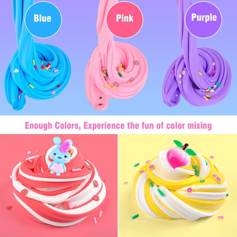 - 56-Pack Slime Set: You will get a box of 56 slime squeeze toys and 7 accessories including peach, unicorn, mermaid, watermelon, bunny, 3 packs of slices for DIY slime making