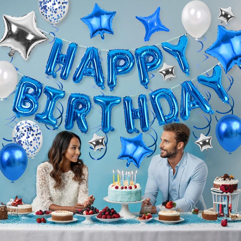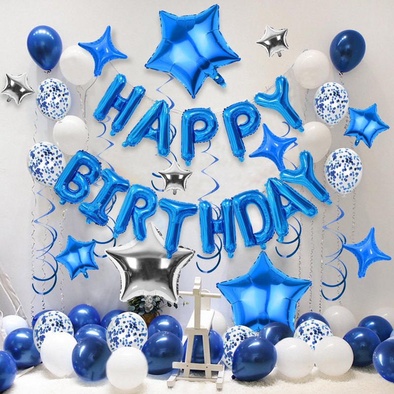 - PACKAGE: The set includes 13pcs blue happy birthday letter balloons, 18pcs star balloons in different sizes, 5pcs silver balloons,5pcs blue balloons,5pcs confetti balloons and 6pcs blue hanging swirls for total decoration