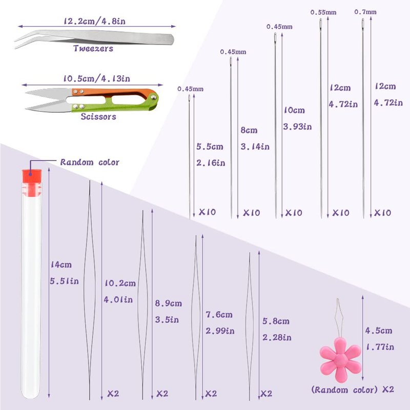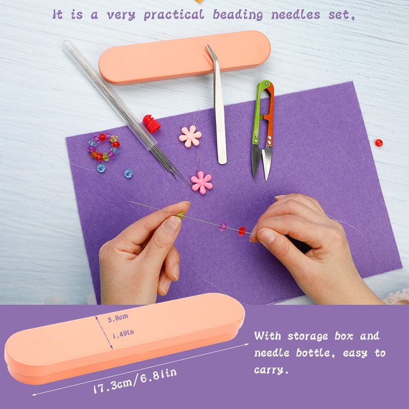 - Beading Needles Set: Beading needles set includes 50 x long straight beading thread needles, 8 x big eye beading needles, 1 x needle bottles(random color), 2 x needle threaders(random color), 1 x random color tin box box. 1 x yarn scissors(random color).1 x elbow tweezers. It is a very practical beading needles set.