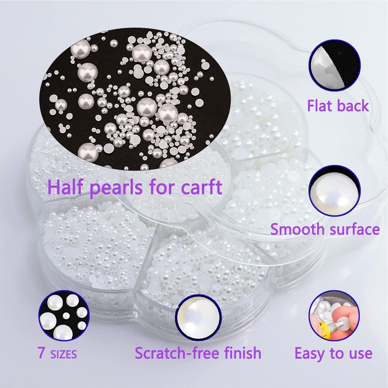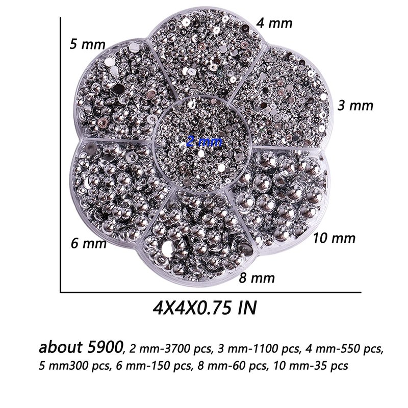 - Package Content: Our flatback pearls gems come well organized in a camellia petals plastic box with different compartments to separate the sizes of the pearls which vary from 2mm to 10mm to be specific, about 5900 pieces of half pearls for crafts, half pearl beads flatback pearl beads have enough quantity and rich style to meet your handmade, decoration, replacement needs.