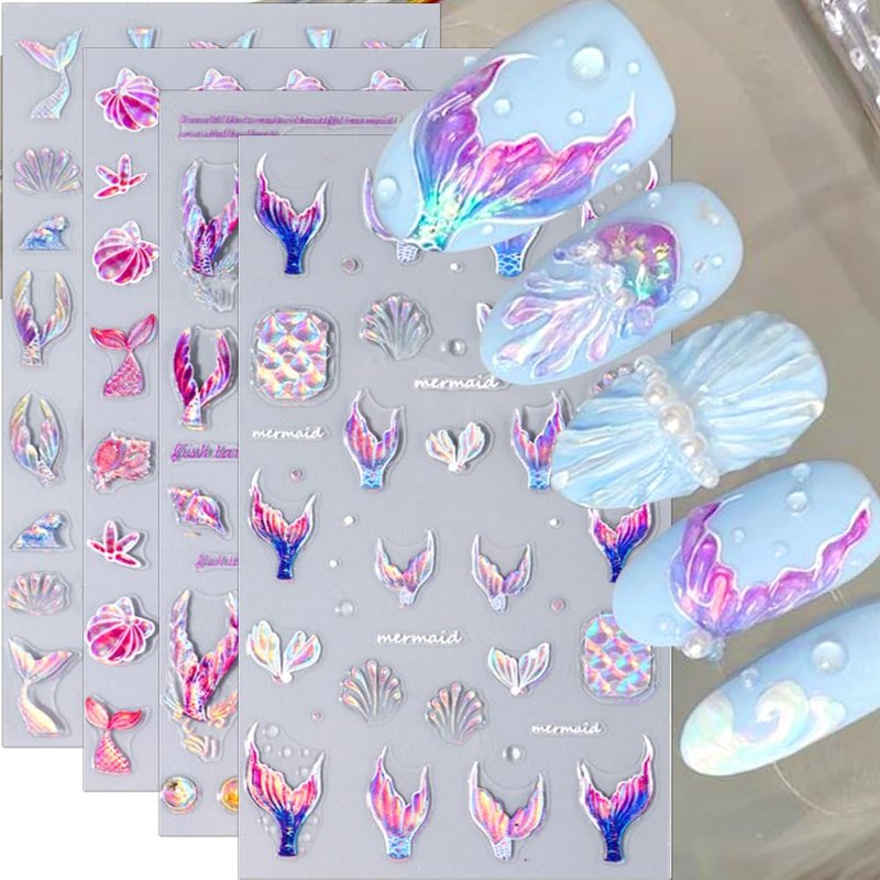 - ➤【Dreamy Mermaid Tail Nail Stickers】5D stereoscopic relief dreamy fishtail nail stickers iridescent fish tails exude a slight luster, like the mermaid in the fairy tale bathing in the sun, romantic and fantasy, the mermaid nail stickers can easily create texture nails, let your nails bring a mermaid-like dreamy feeling.