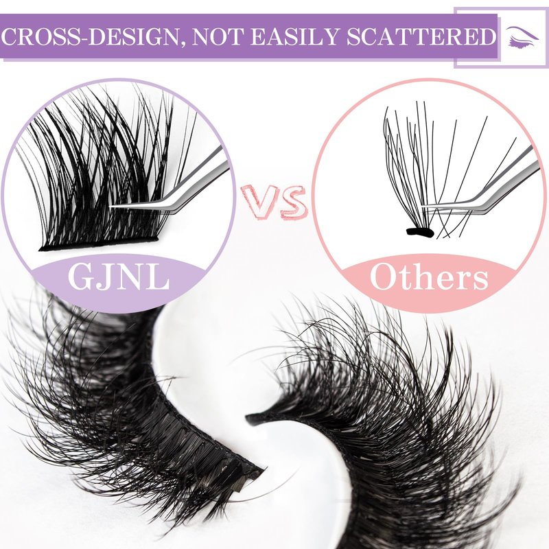 - High-Quality Fake Eyelashes: GJNL faux eyelashes are made of imported materials, super soft, and lightweight, lashes mink look real, not plasticky, and have gorgeous results, latest cross Design makes lash clusters that do not easily fall apart. High-quality synthetic lashes blend with and look like your own lashes with full bouncy volume & curl. Soft, lightweight, vegan, knot-free, and matte dark.