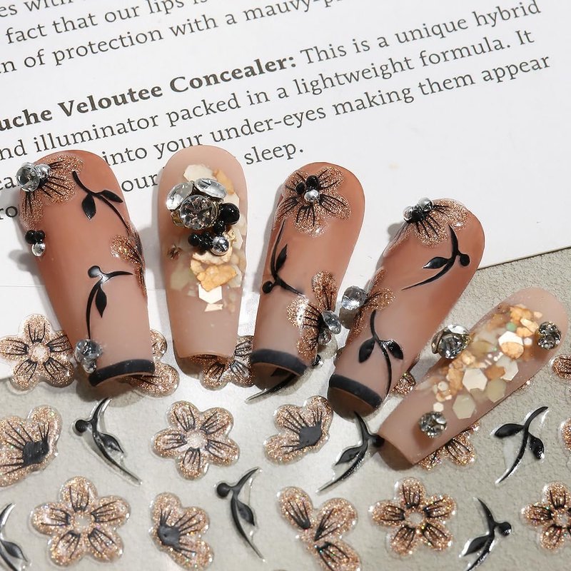 5D Flower Nail Stickers for Nail Art Brown Daisy Gel Nail Stickers Summer Embossed Nail Art Stickers Bling Nail Decals Self-Adhesive Nail Decal with Floral Designs Nail Art Decoration Manicure DIY