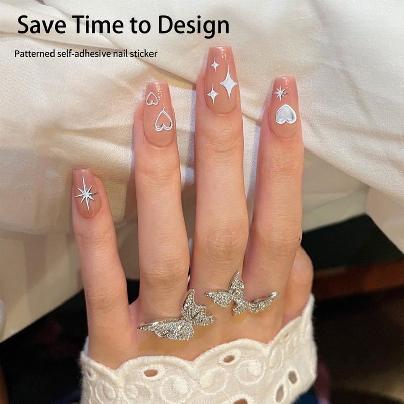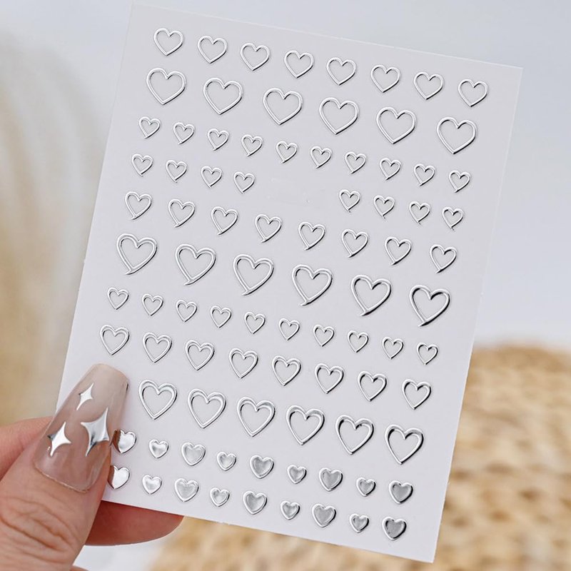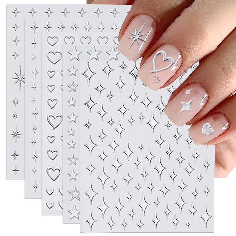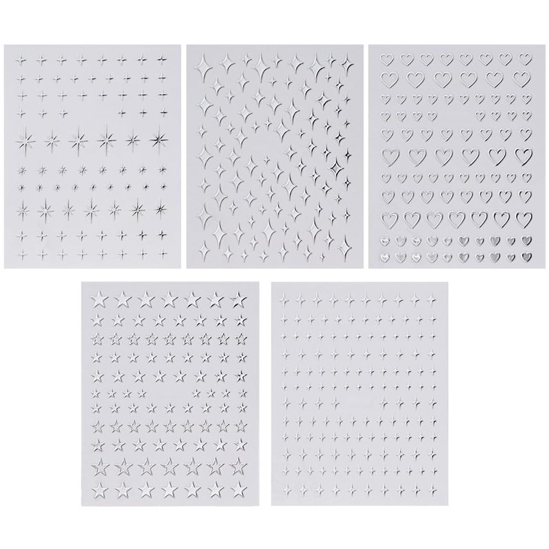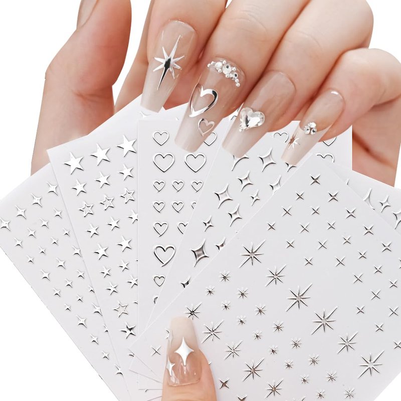 - √【Silver Nail Stickers for Nail Art】You will get 5 sheets of mirror metallic silver nail art stickers for nail designs, including some classic patterns such as hollow out hearts, solid love heart, four-pointed star, hollow out pentagram, solid pentagram and starlight.