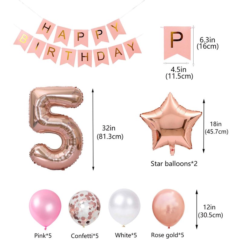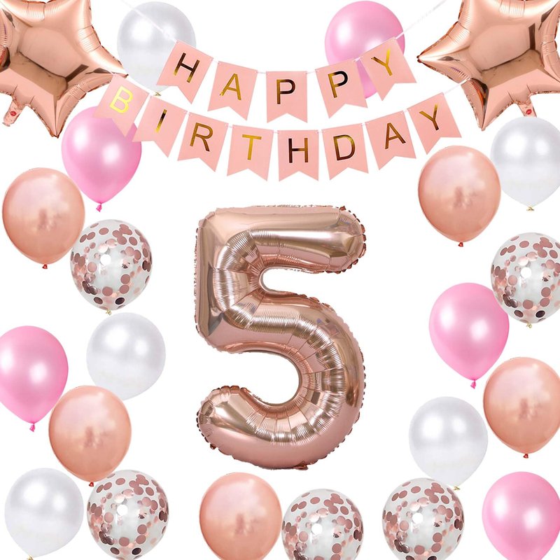 - Birthday Decorations Rose Gold Sets Include: 1 * Rose Gold 'HAPPY BIRTHDAY' Letter Banner, 1* number foil balloons, 2* star foil balloons, 20 latex party balloons in 4 styles(5* pink color, 5* rose gold confetti, 5* white, 5* happy 14th birthday), 1* 10m ribbon. Total 26packs in one package.
