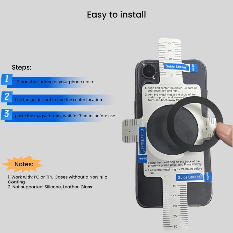 - Installation of the Mag safe sticker requires no professional skills and takes only a few seconds to complete. Tear off the protective film and release paper, paste and use. It is recommended to stick on PC or TPU phone cases without anti-fingerprint coating, it is not compatible with silicone and leather phone cases.