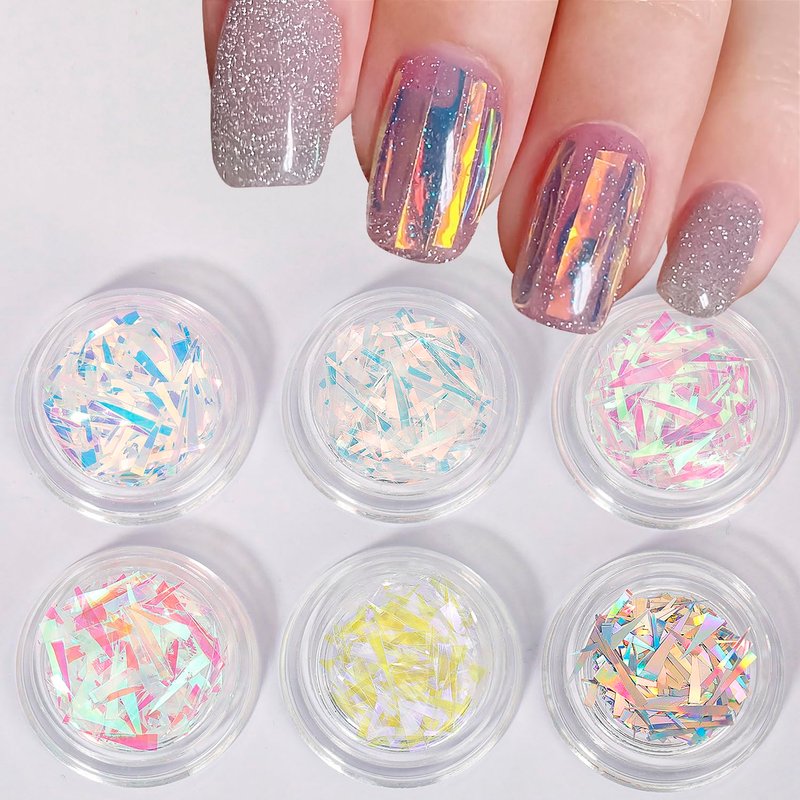 6 Box Aurora Nail Foil Stickers, Colorful Glass Paper Holographic Transfer Decals, Shiny French Art Supplies for Acrylic Nails, Manicure Nail Foil Transfer Stickers Set, Girls DIY Nail Decals for