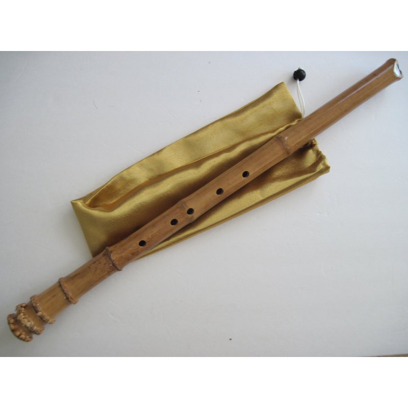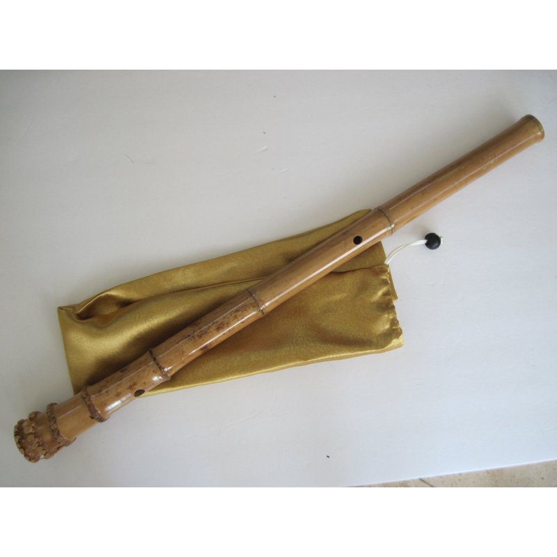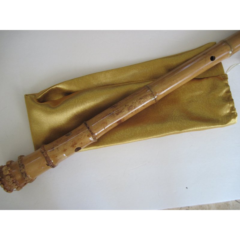 6 Holes Shakuhachi Dong Xiao G Key w. root End Bamboo Flute Zen Instruemnt Kinko Voicing Hole with Bamboo Canister from High Altitude Seasoned Bamboo Forest in Central Taiwan (Nantou County). Regarded as a Zen instrument. Sounding is clear and resonate passively in the serene bamboo forest country setting. Specification: Length is : 26 inches. Weight : 350 g (12.4 Oz) No. of bamboo Nodes : 8 One thick satin fabric bag is included as shown in the picture.