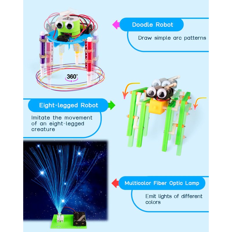 - 6-in-1 STEM Kit for Kids: This set includes 6 exciting projects—Hand-Cranked Bubble Machine, Multicolor Fiber Optic Lamp, Doodle Robot, Eight-legged Robot, Crawling Robot, Balancing Robot — all designed to inspire creativity and teach essential STEM skills. Perfect for kids aged 6+ to explore engineering, robotics, and renewable energy.