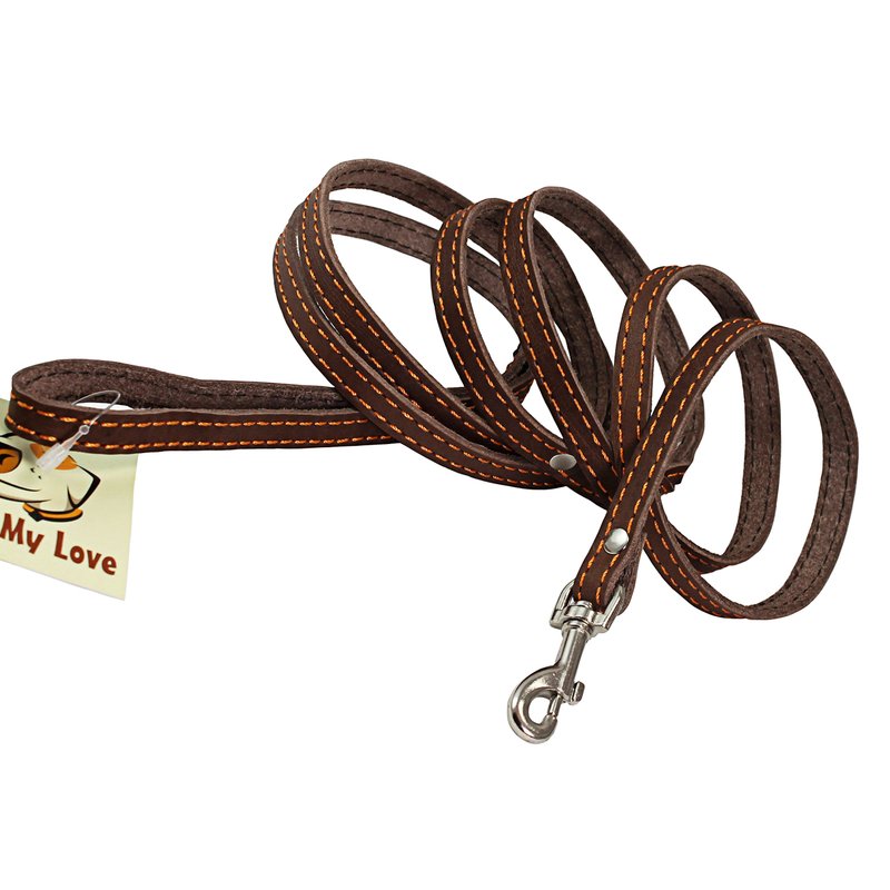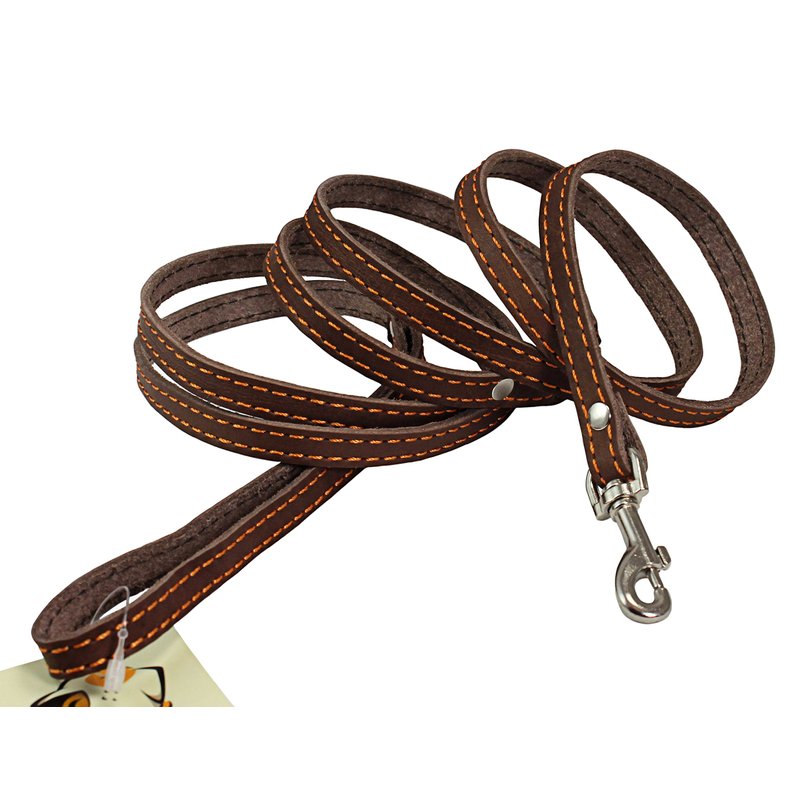 A premium quality leash made of soft genuine leather with nickel plated swivel snap. 6 ft long and 3/8" wide. Trimmed with thick waxed thread. Snap riveted for extra strength. Most suitable for Small/XSmall breeds and puppies.