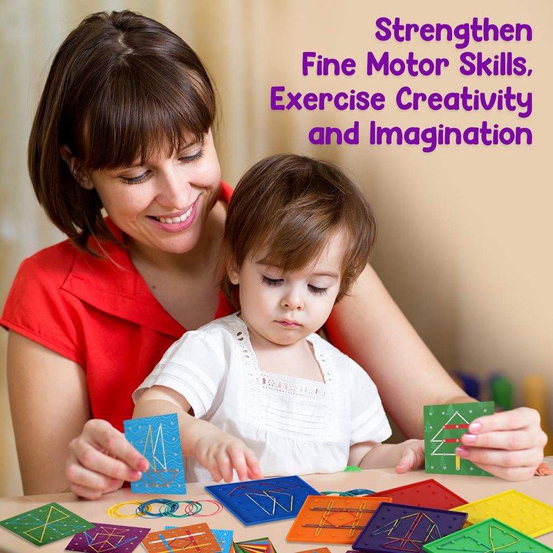 - AMAZING BOARD TO CREATE AWESOME PATTERNS - Time to enhance those creative minds! Stimulate children's creativity and imagination, keep their hands busy with these plastic board and rubber bands geometry toy. Your child can use them to create a variety of shapes, letters, animals, trees, and other objects, the possibilities are endless