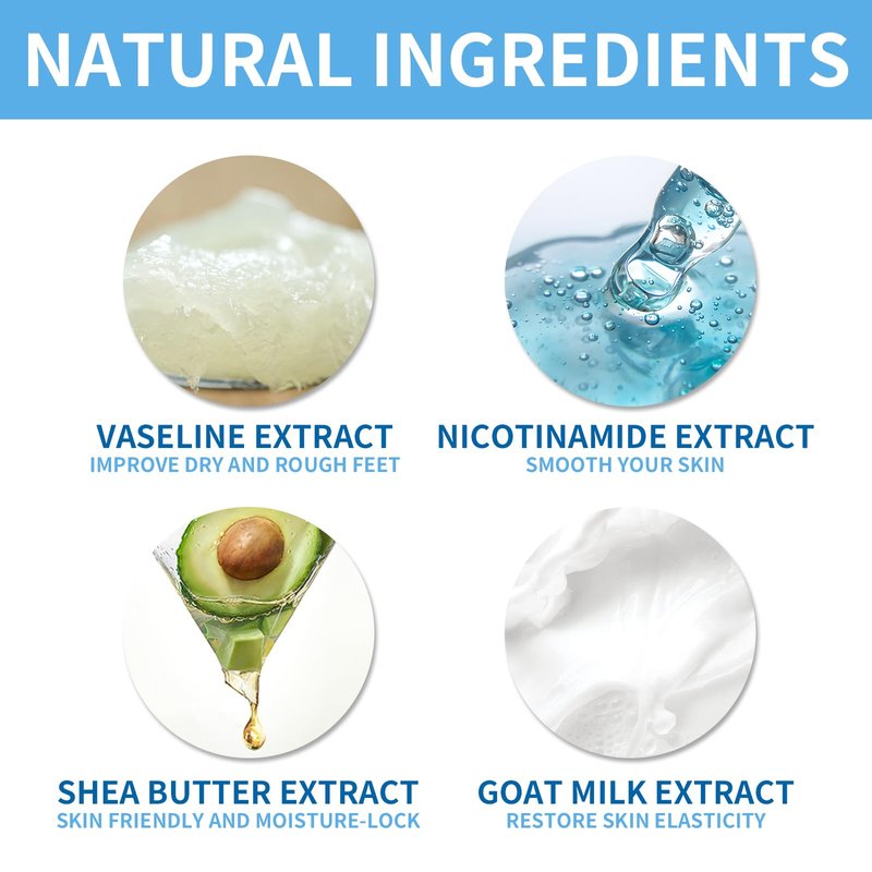 - [Multiple natural ingredients]: Rich in Vaseline extract, Nicotinamide extract, shea butter extract, etc; Softening the dry and rough skin of the feet, Restoring youthful and elastic of foot skin;