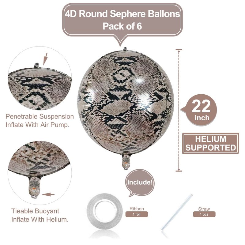 Package included:6 Packs 22 inch animal python print 4d foil round balloons+1pcs straw+1pcs 32 foot Ribbon Roll. These 4D animal print balloons will be the most amazing decorations, especially for those happy event, such as Kids Birthday, Baby shower , Bachelorette,Theme parties, also can be use for School and kindergarten, this 4D balloons will the best choice for you, will not let you down