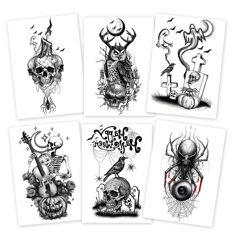 - SPOOKY GOTHIC HALLOWEEN TATTOOS::-- This 6-pack of temporary tattoo stickers features haunting designs including skulls, spiders, owls, ghosts, and more. These tattoos are perfect for Halloween, cosplay, or adding a spooky touch to your party makeup.