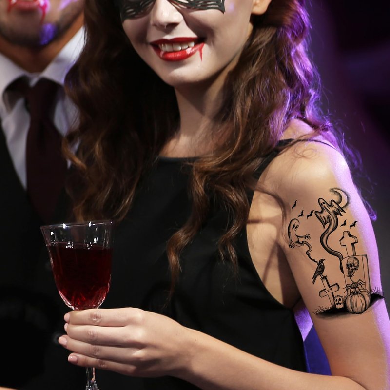 - EASY APPLICATION AND REMOVAL::-- These temporary Halloween tattoos are easy to apply with water and just as simple to remove with soap and water. Perfect for quick costume changes or adding a creepy twist to your look at any Halloween event.