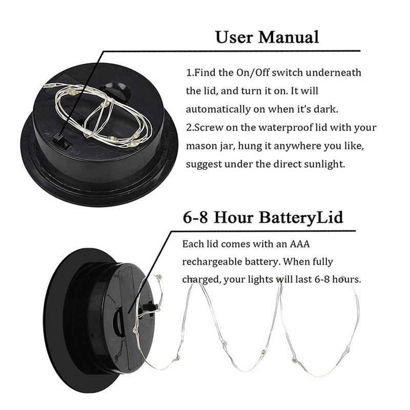 - Solar Powered Mason Jar Lid Lights. - Energy Saving & Environment Friendly. 100% solar powered solar panel, no requires external wiring. 1.2v/600mAH AAA rechargeable battery included. It need take 6-8 hours charging time by fine sun light, light up for about 8-12+hours.
