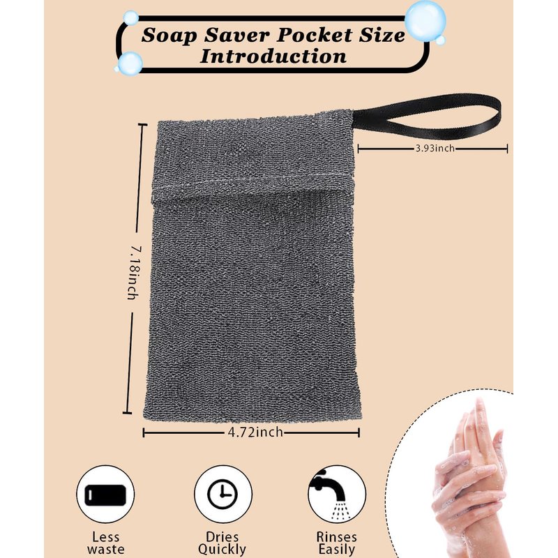 - 🌙Pack and material:6 Packs grey soap pocket exfoliating soap saver pouch made of high-quality nylon fiber. The soap pocket is strong, not easy to get rips or falling apart. It is a mesh bar soap bag foam lather pouch. Always keep its shape and used repeatedly. ★☆Attention: It is recommended to soak the product in warm water before receiving it for use, as it will become comfortable.