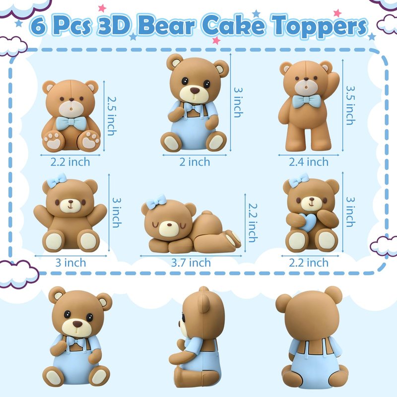 - What You'll Get: 6 pieces of 3D bear cake toppers, 6 different cute bear body designs with pleasing colors that blend seamlessly with any cake design or party theme and bright color schemes that make them instantly appealing to kids and adults alike, making your cake stand out from the crowd; The appropriate size design of 3 inches can be easily placed on the cake of different sizes without being too large to obscure the cake design