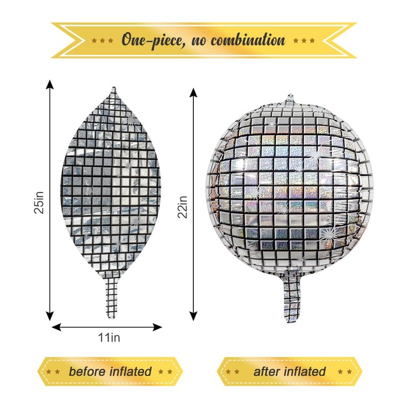 - ✨EASY TO USE: Metallic mylar foil disco balloons seal themselves and do not need to be tied. You just need to fill the disco balloon with air or helium with a pump and you can get a giant 22-inch balloon. Inflated with air disco balloon can not float, but inflated with helium can. There is a little hole on the top of the balloon, offering hangable options. And the disco mylar foil balloon is reusable. silver party decorations silver balloons galaxy balloons silver birthday decorations