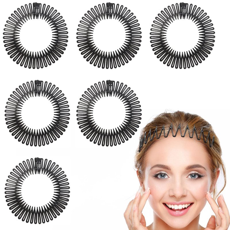 6 PCS Full Circular Stretch Comb Headbands Plastic Flexi Comb Circle Headbands with Teeth for Women's Hair Flexible Plastic Circle Comb Women Lady Stretch Plastic Full Circle Hair Comb (Black)