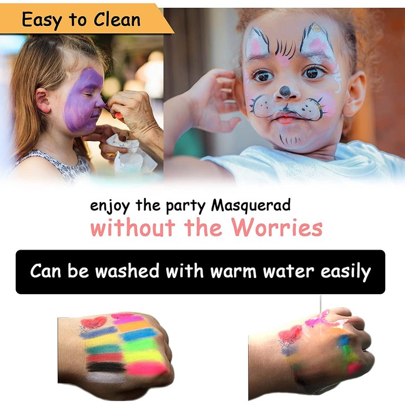 - [SAFE FOR TODDLERS AND KIDS] face painting kit includes washable crayons that are easy to remove with mild soap and warm water. The glow of black light body paint is also made from food-grade coloring and skin-safe ingredients that will not irritate the skin of children and toddlers.