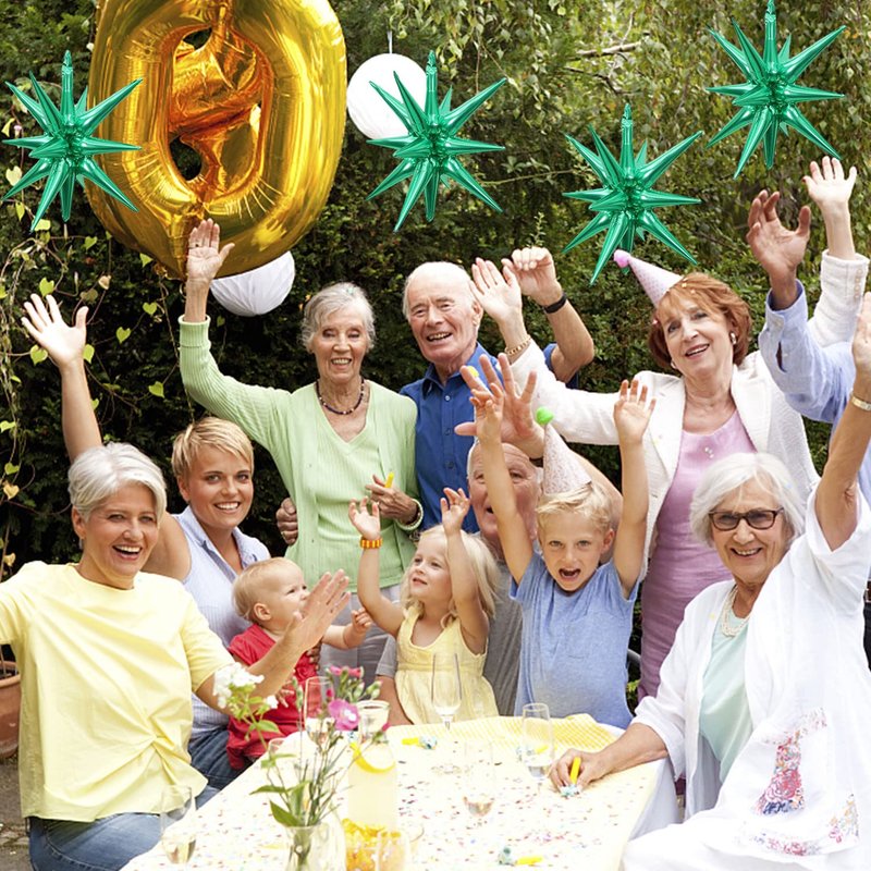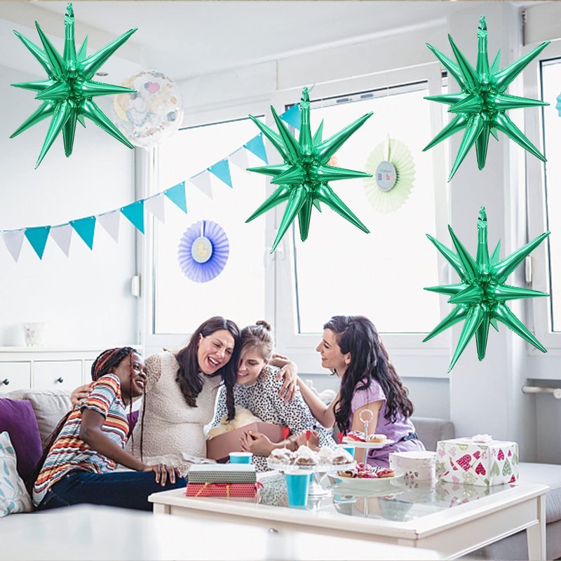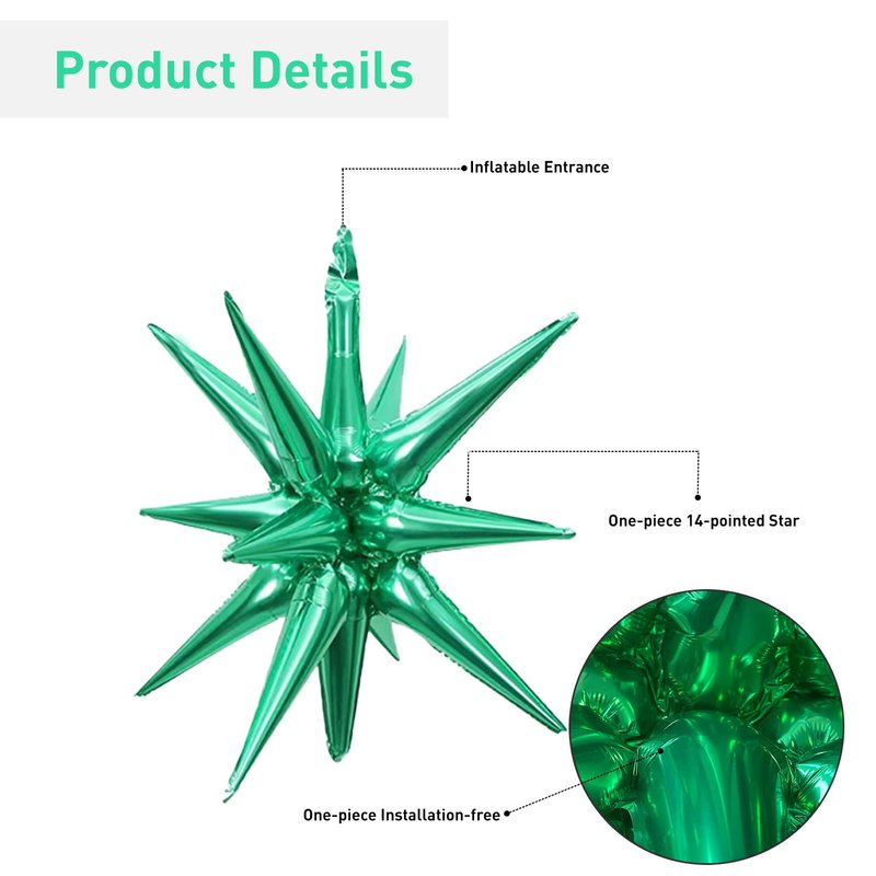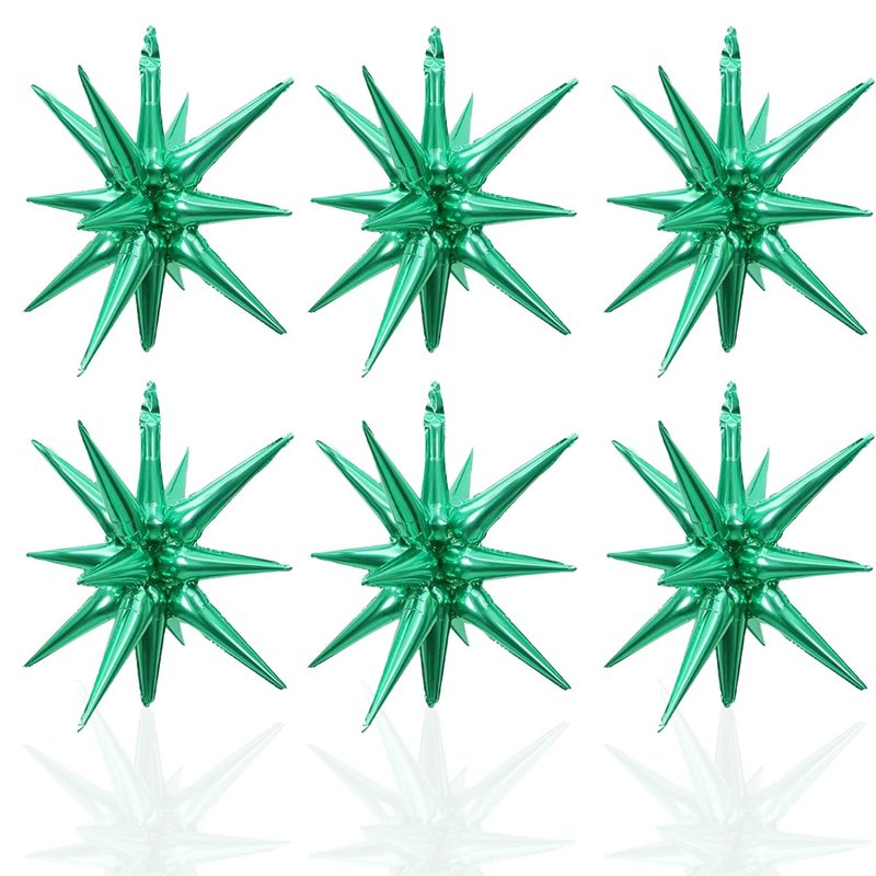 6 Pack 14 Point Foil Cone Balloons Starburst Cone Mylar Balloons Large Explosion Star Balloon for Wedding Birthday Party Photo Booth Decoration Supplies, Green One-Piece 14-pointed Star Explosion Balloons 6 pcs PRODUCT SPECIFICATION: Material: Aluminum foil. PACKAGE CONTENTS: 6pcs silvery explosion star balloons SIZE: Each foil cone balloon measures approx 22 inches after inflation Easy to use: Use the inflator to pump the foil disco ball balloon to 80% by air or helium, when inflation being completed, pull out the inflator and pinch the inflation inlet flat. The air outlet will be automatically sealed by its matched self adhesive glue of the balloons inlets, and no additional knots are required (inflator is not included).