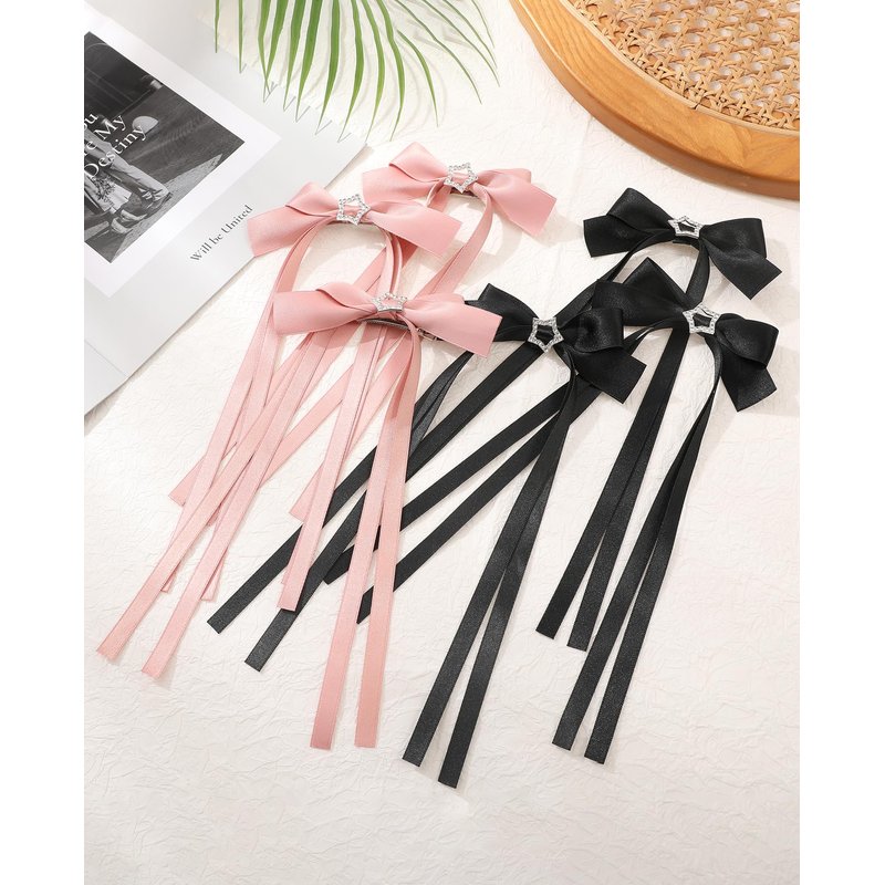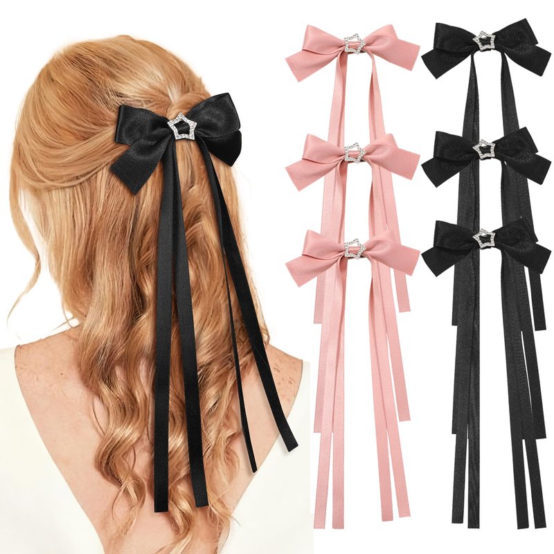 6 PCS Hair Bows for Women-Silky Satin Hair Ribbon Hair Bow Clips Tassel Bowknot Hair Clips with Long Tail Star Bow Hair Barrettes Bow Accessories for Women Girls(pink+black)