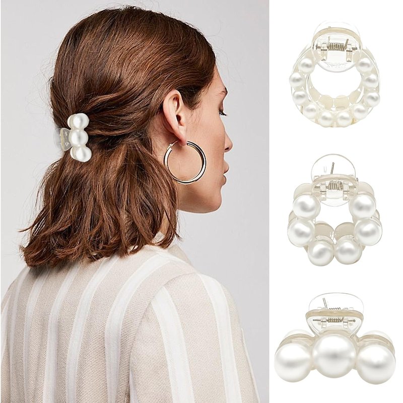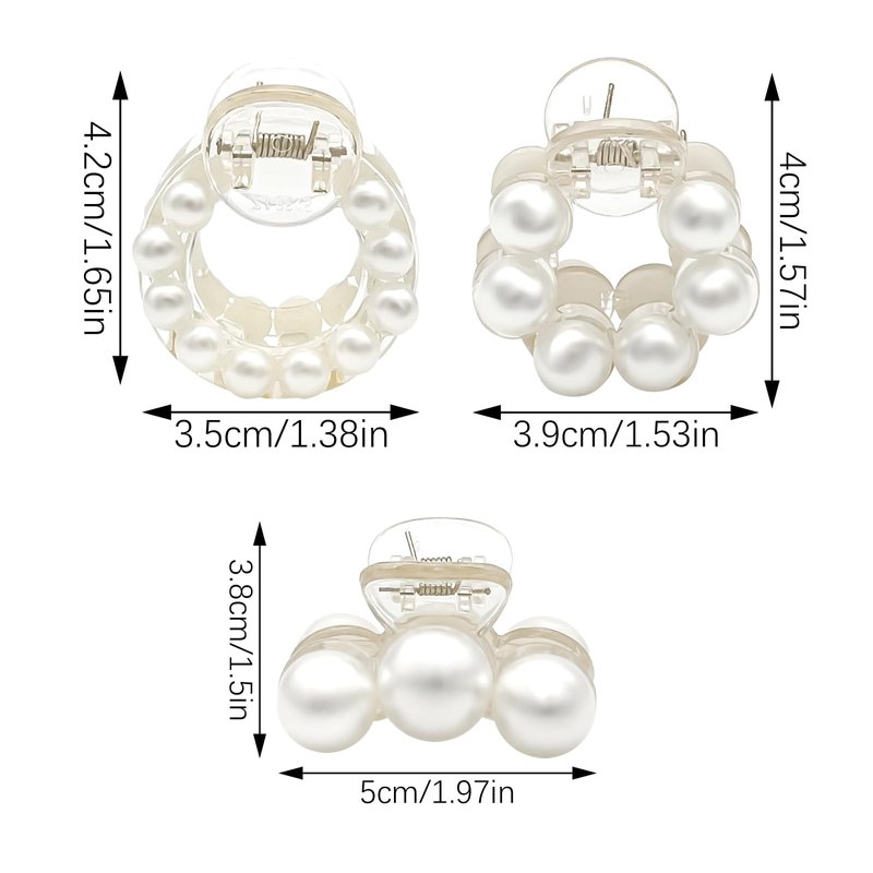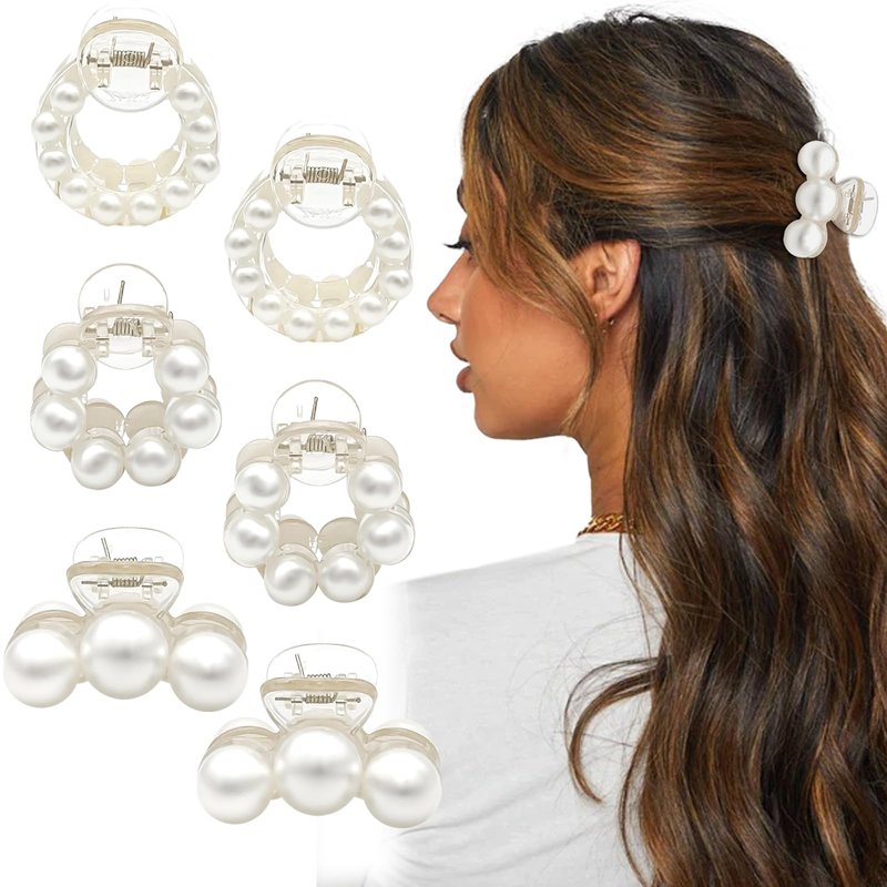 6 Pcs Small Pearl Hair Claw Clips for Women Girls Specifications: Style: Three-round pearl hair clip, Small pearl bead round hair clip, Big pearl bead round hair clip. Material: Plastic, Artificial pearls Package includes: 6 pcs pearl hair clips for women Feature: Perfect for any hairstyle including thick, thin, curly, fine, short, or long hair, and perfect for all ages to make any hairstyle.