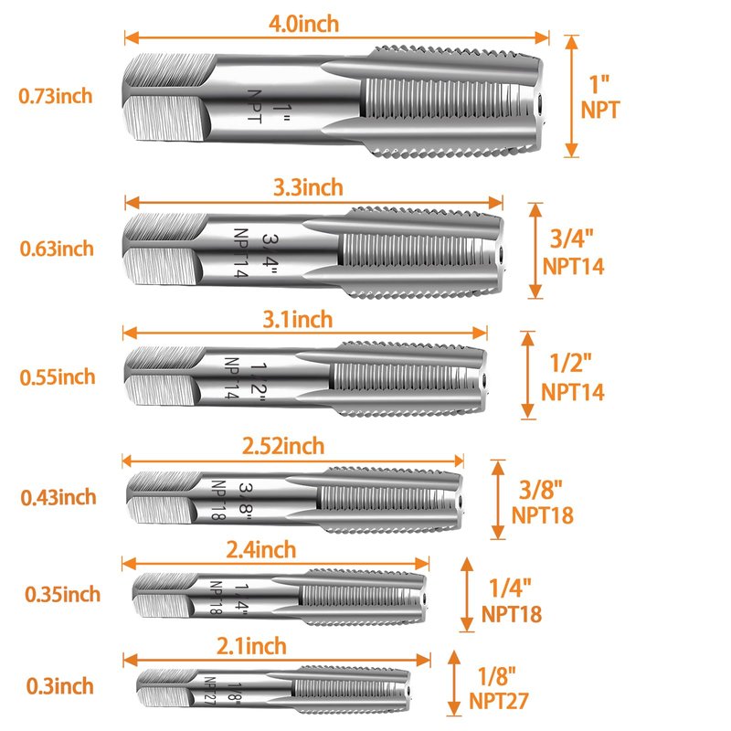 Product Description: Our National Pipe Taper (NPT) taps, offers a comprehensive solution for various pipe threading requirements. These specialized taps are perfectly suited for the task of cleaning or re-threading pipes that have become stuck or damaged. Their design and functionality make them highly effective for addressing these specific challenges encountered in pipe maintenance and repair. Features: This NPT tap set includes 6 popular tap sizes: 1”, 3/4", 1/2", 3/8", 1/4" and 1/8". The size is nominal, rather than the actual diameter dimension of the tap. When selecting a tap, you would choose one with the same nominal size as the pipe fitting you intend to thread or create threads in. With this range of sizes, you can easily tackle a wide variety of projects. The NPT taps come neatly packed in a sleek plastic case, offering protection against rust and enabling easy storage and quick access to your pipe threading tools. Specifications: The NPT thread design provides a tapered form that creates a solid and leak-free connection between pipes and fittings. The NPT thread specifications for each size are as follows: The 1/8" NPT tap has a threading density of 27 threads per inch. The 1/4" NPT tap has a threading density of 18 threads per inch. The 3/8" NPT tap has a threading density of 18 threads per inch. The 1/2" NPT tap has a threading density of 14 threads per inch. The 3/4" NPT tap has a threading density of 14 threads per inch. The 1" NPT tap has a threading density of 11.5 threads per inch.