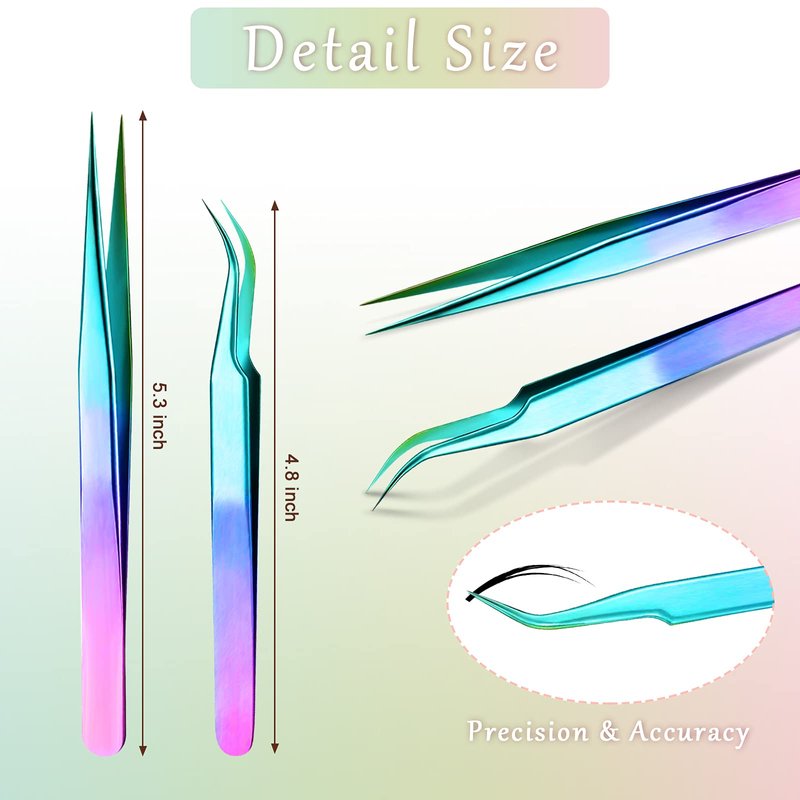 - Different functions: 4.8 inches long curved-tip tweezers are very suitable for separating eyelashes or selecting individual hairs, while 5.3 inches straight tip tweezers can be applied to pick up lashes and flowering, helping you to quickly and accurately select on eyelash extensions