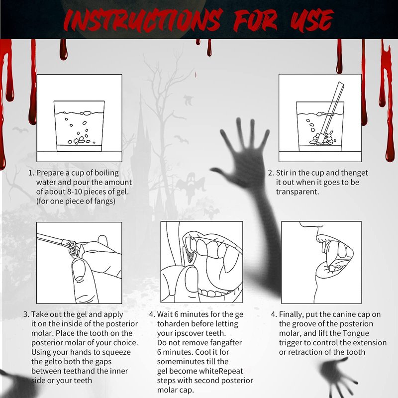 - Retractable design: creepy fake vampire fangs teeth are designed with tongue controlling part, and the tongue controls the level and then the level drives the teeth up and down, which can adapt to canine, incisor or mandible; Besides the material is stable to ensure use many times