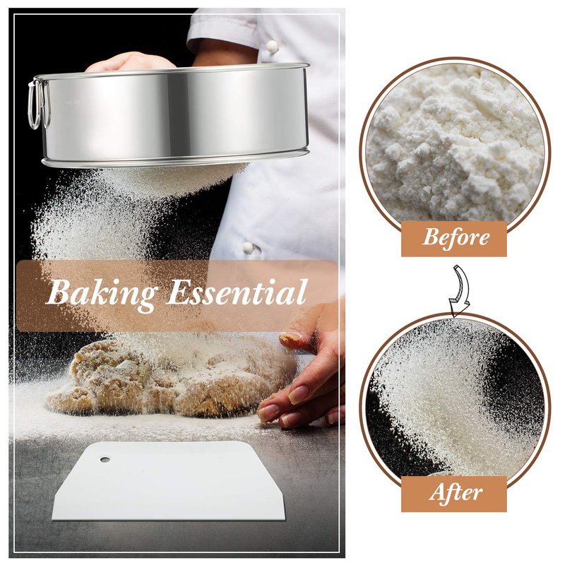 - Using instruction: pour the flour into the flour sieve, then shake it back or pat the flour sieve, the scraper can not only cut dough but also mix the powdery substances; Two scrapers of different sizes can be applied with different sizes of flour sieve to make the powder easier to pass through the flour sieve, for removing and breaking up clumps from ingredients before baking or cooking, the sieved flour will be more delicate, and the biscuits and cakes will be smoother