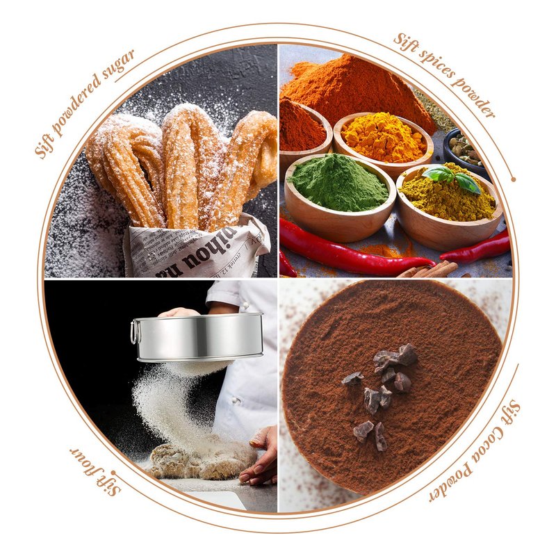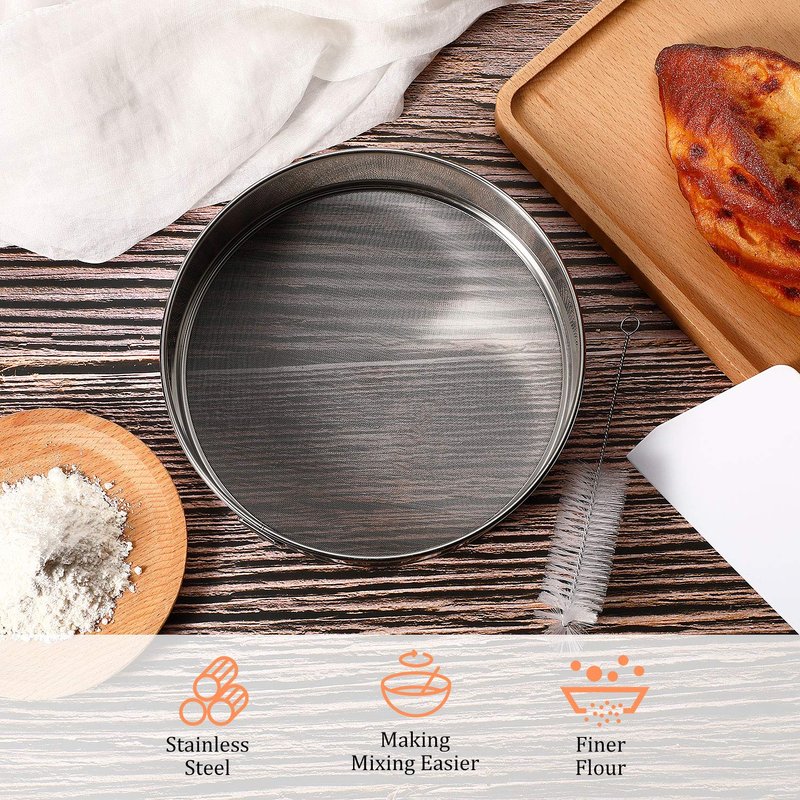 - Easy to clean: selected tamis, safe and does not hurt the hand; If you find it a little difficult to clean, we also specially equipped with a cleaning brush, which may make it easier for you to clean your sifters; Just rinse with tap water or wipe with a wet napkin, dishwasher-safe, the sieve with hooks is also convenient for storage and carrying