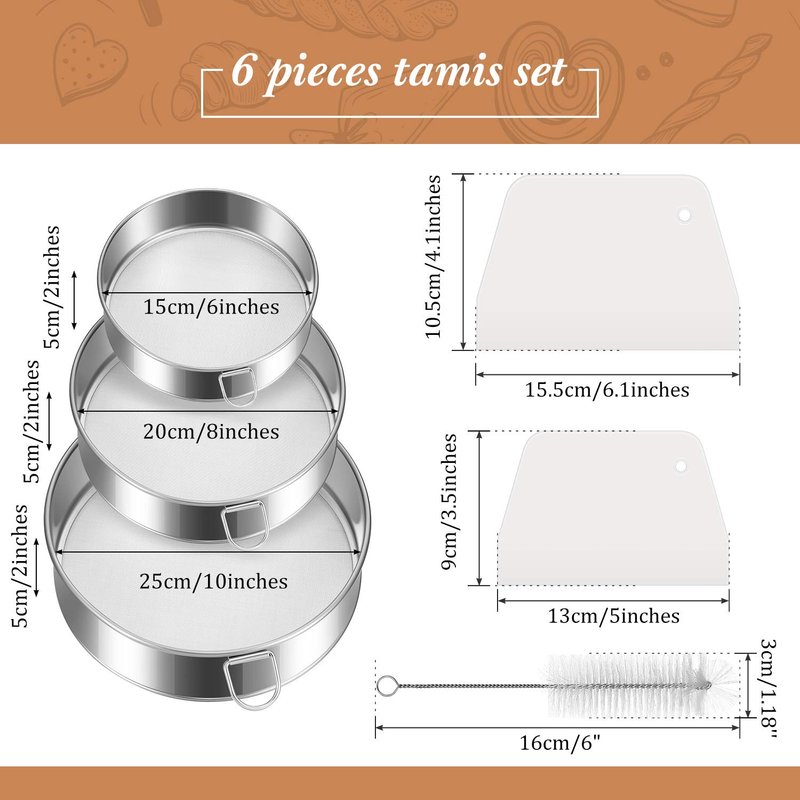 - Tamis flour sieve set: you will receive a stainless steel flour sieve set, including 3 x flour sieves in 6 inch, 8 inch and 10 inch with 60 mesh, 2 x dough scrapers in 2 sizes, one size is 13 x 9 x 9 cm/ 5 x 3.5 x 3.5 inch, another is 5.5 x 10.5 x 10.5 cm/ 6 x 4 x 4 inch, and 1 x cleaner brush, 6 pieces in total